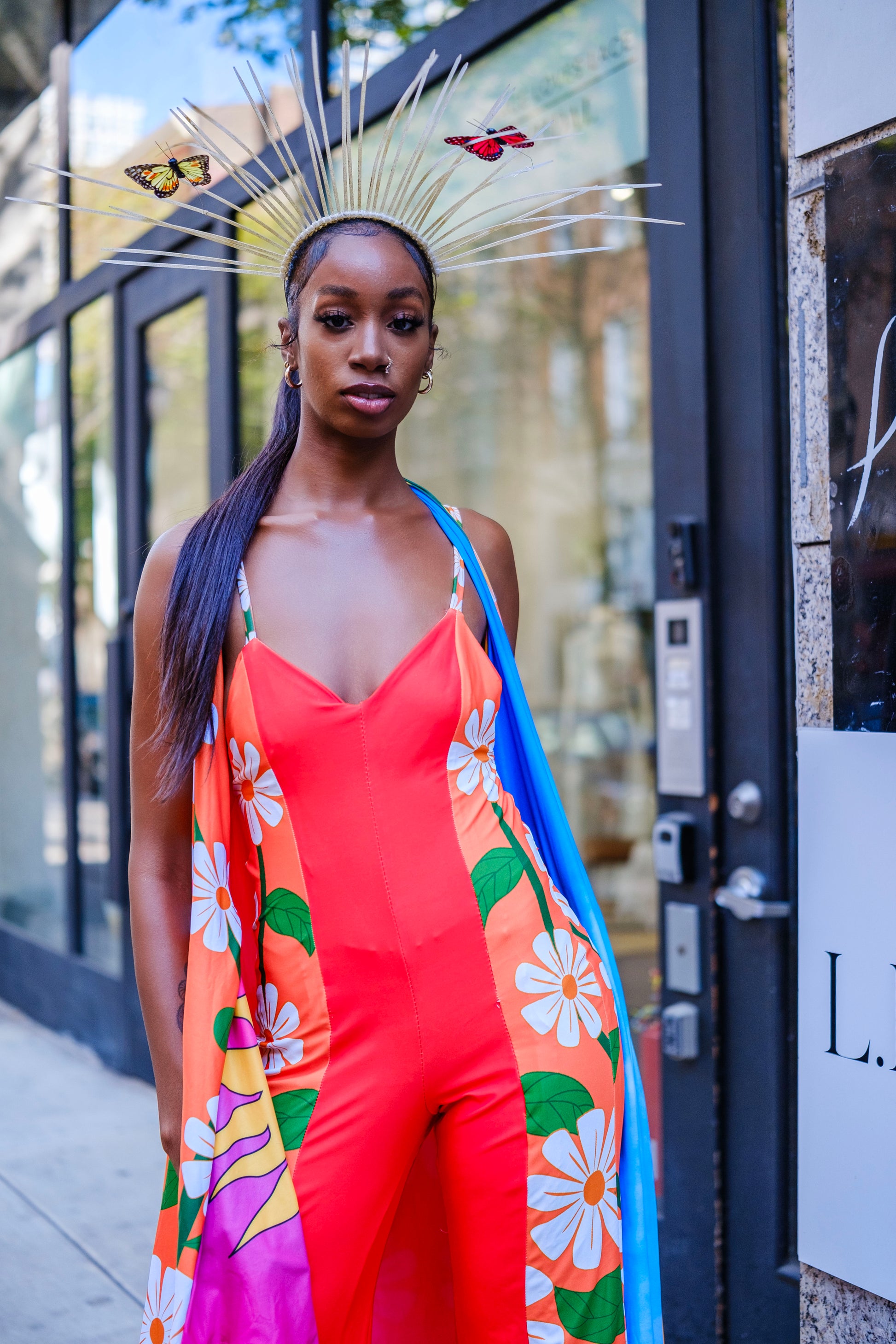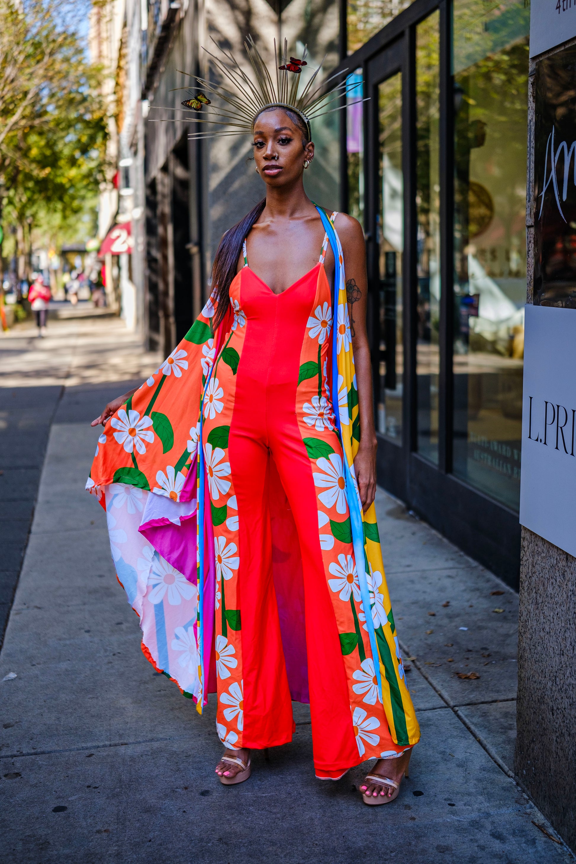 This reversible wrap dress features custom, hand-drawn artwork by designer Kristine Auble. One side shines with a radiant sun and sky motif against a glowing orange background; the other blooms with yellow florals that feel like light in motion.